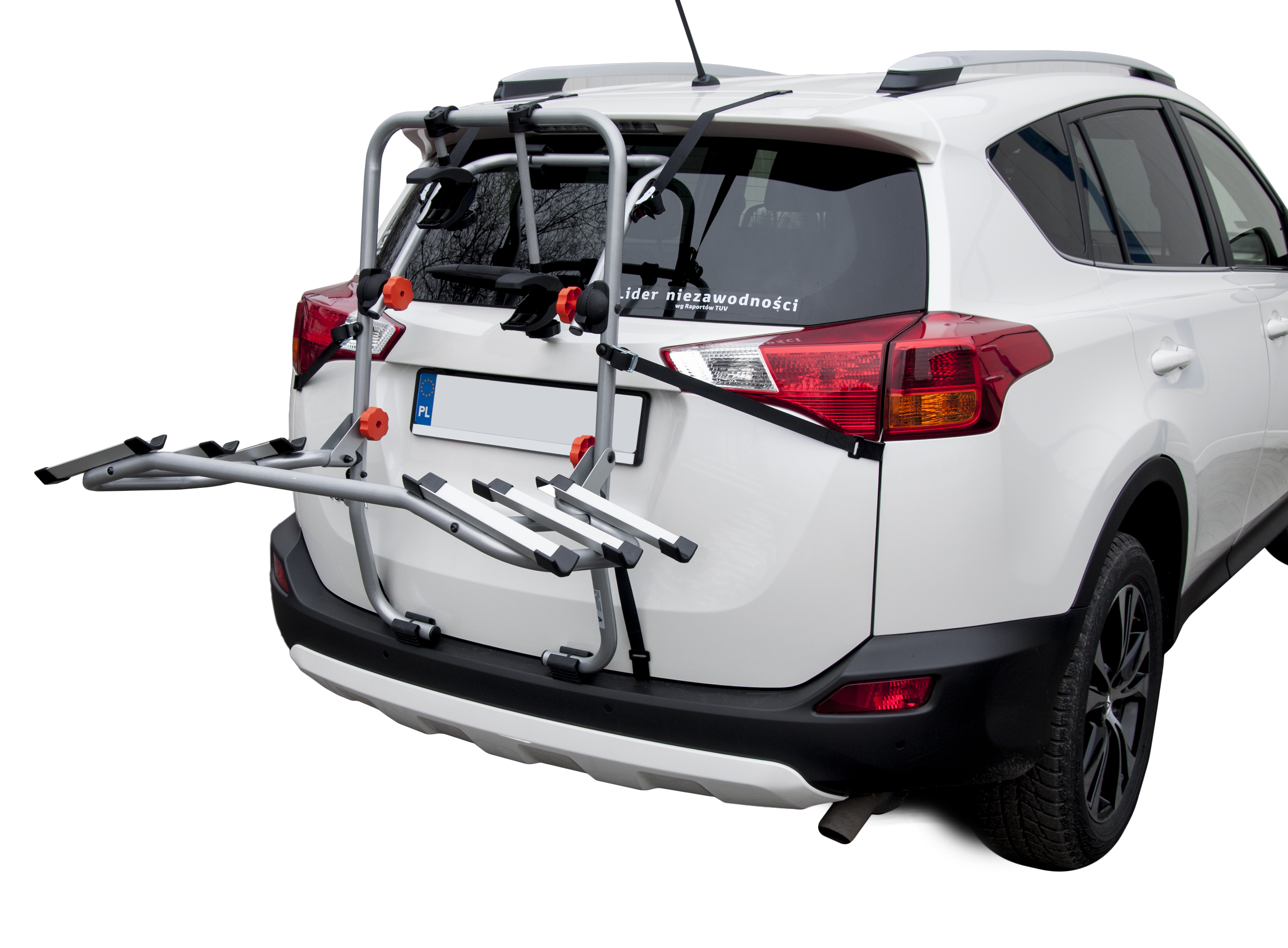 3 rowerów na tylnej klapie w pozycji „stojącej”.